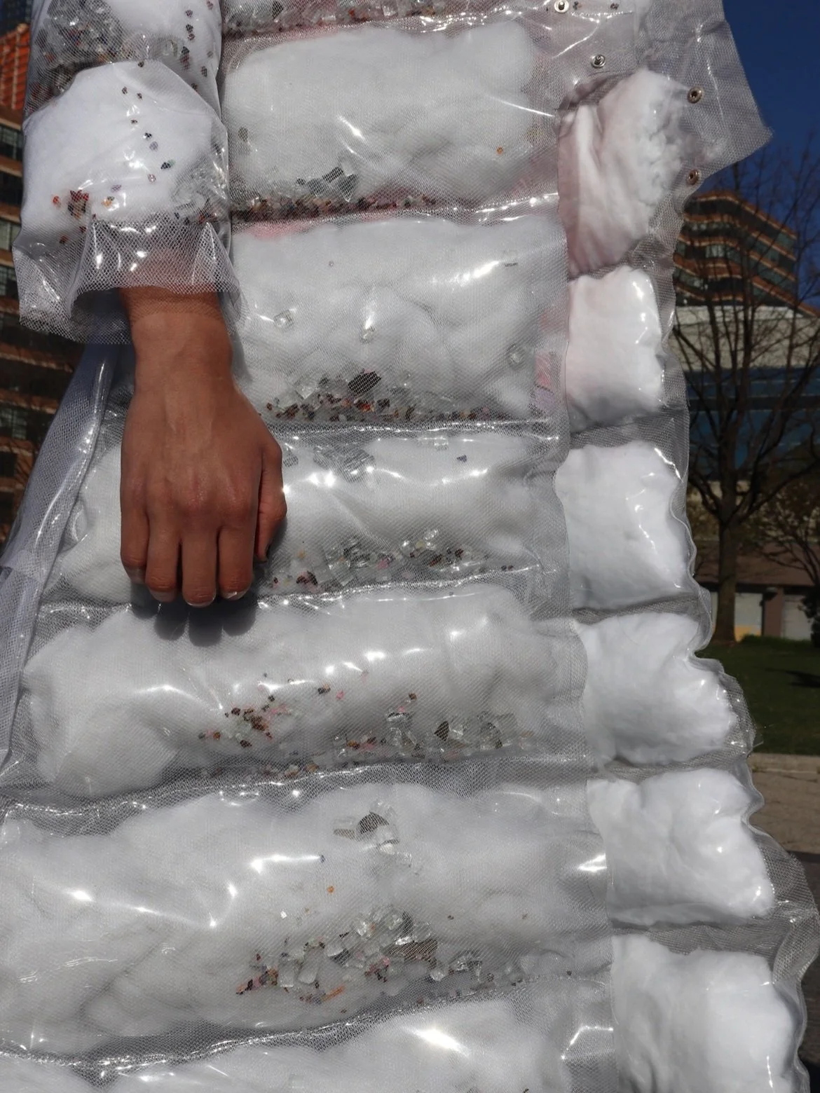 This exquisite haute couture down jacket has been meticulously hand-quilted and incorporates therapeutic, light-reflective crystals that shimmer in the sunlight. It serves as an eco-friendly thermal jacket, harnessing and absorbing heat exclusively from the sun. The exterior is crafted from vinyl, rendering it perfectly waterproof. Beyond its practicality, this jacket serves as a protective shield, shielding the wearer from negative energy, while the crystals within promote a sense of contentment and tranquility.