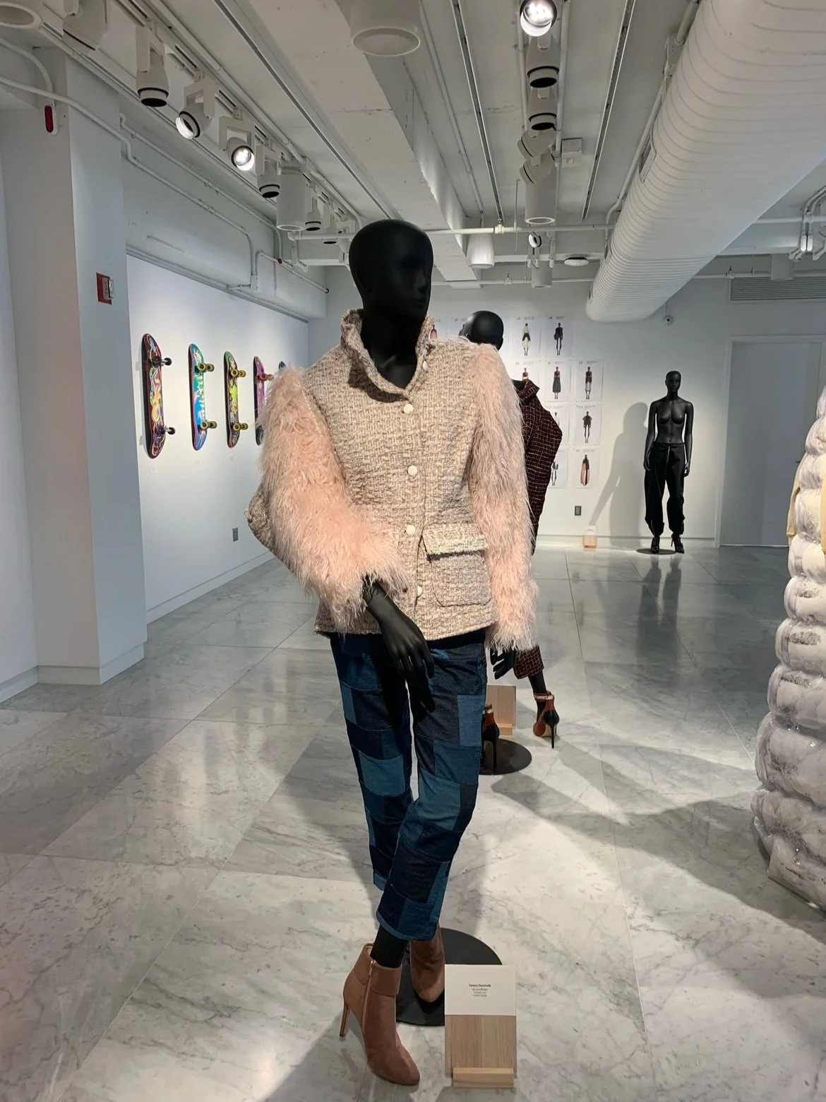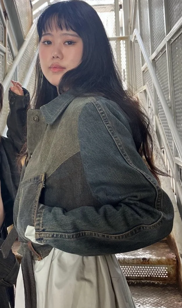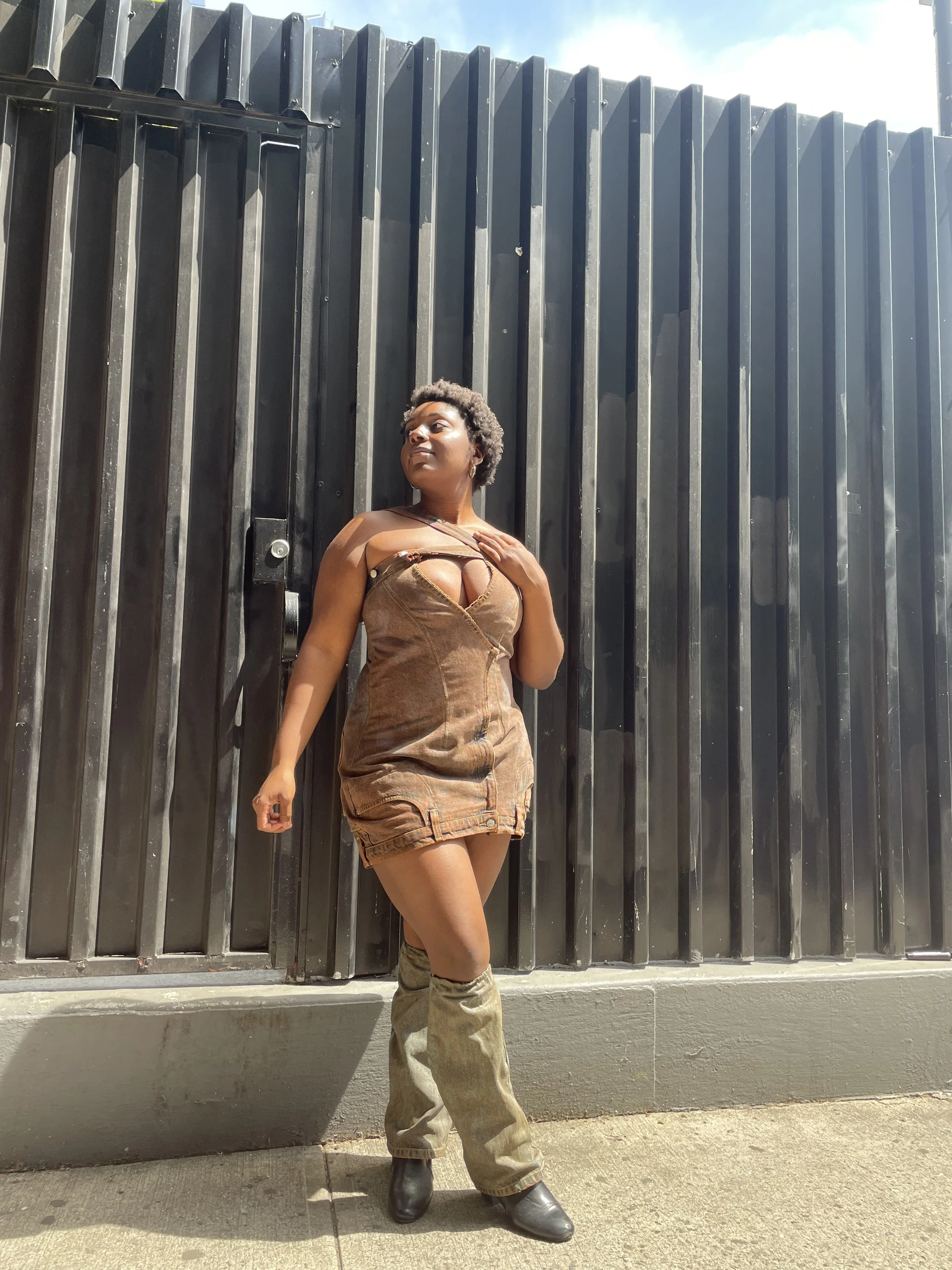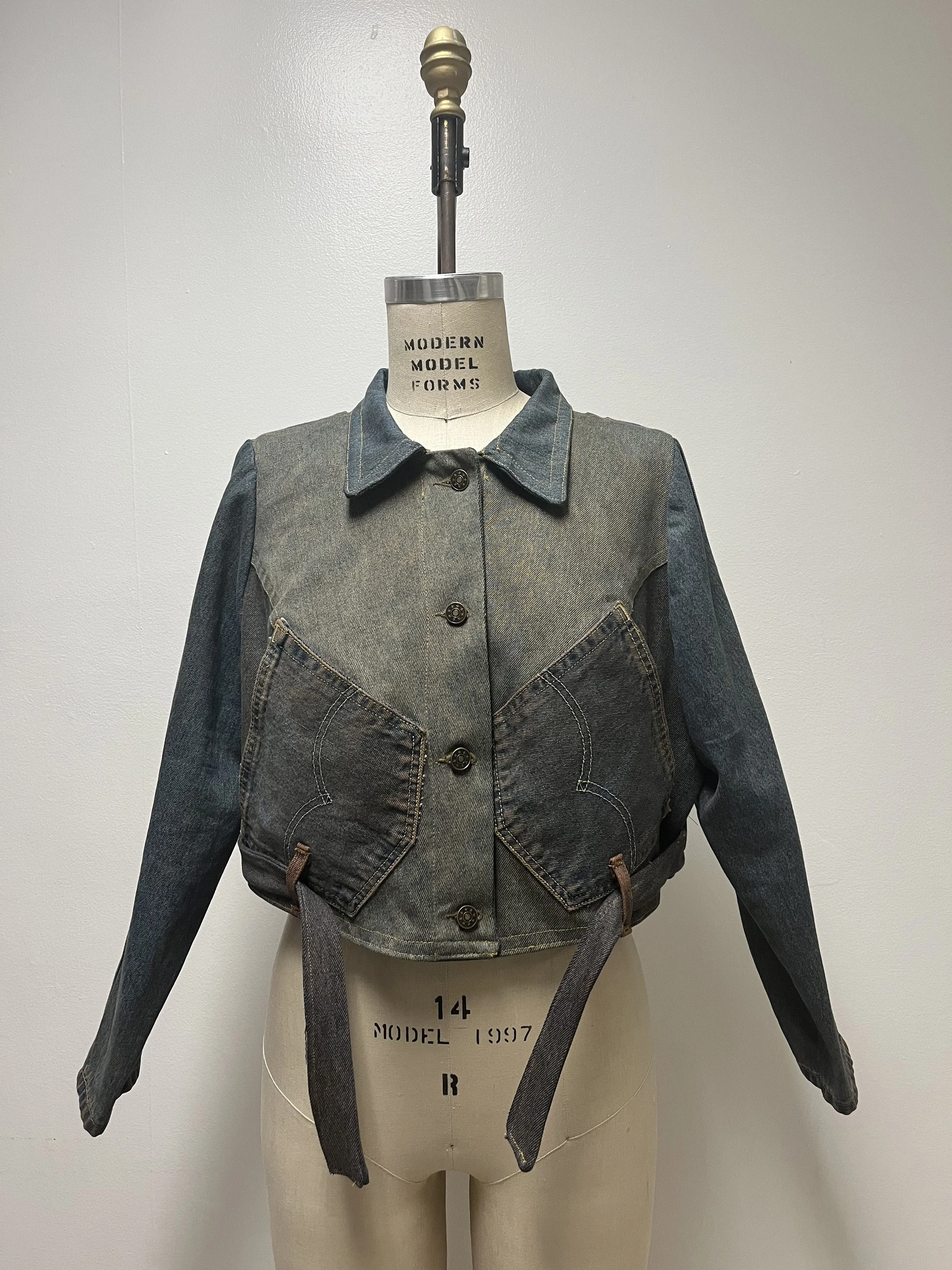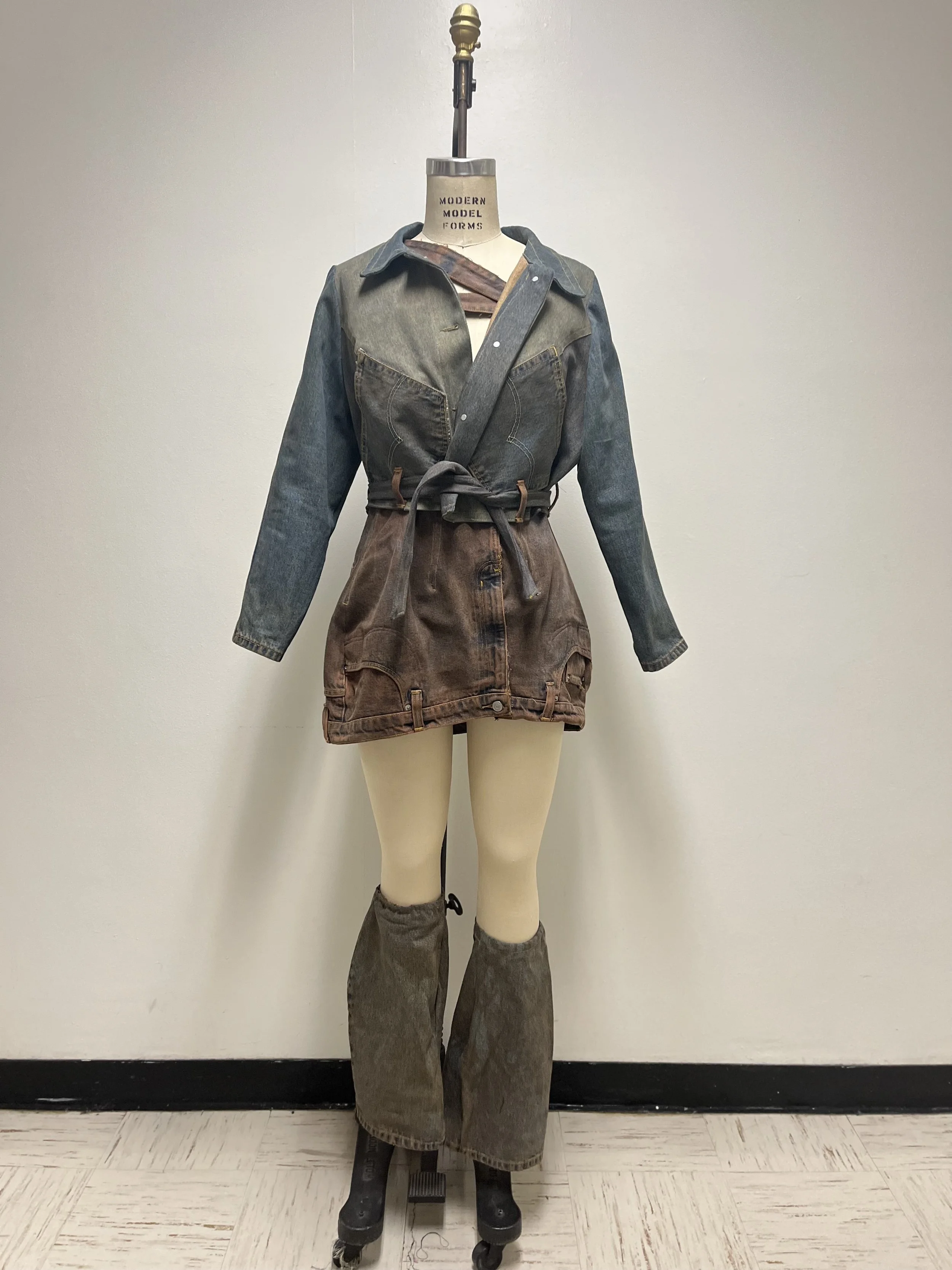 Dress and jacket ensemble crafted from upcycled denim, accompanied by leg warmers.