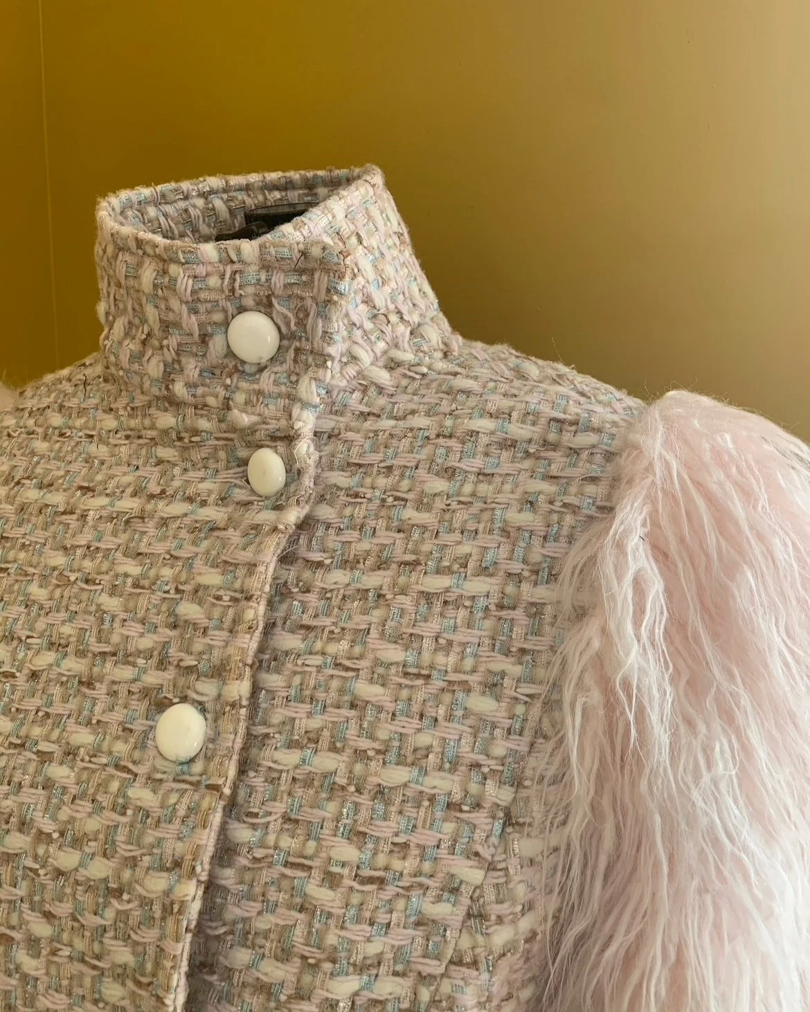 This sophisticated Chanel coat features a satin lining complemented by a wool tweed exterior. The shoulders are skillfully padded, and a dart along the shoulder seam accentuates their prominence. Additionally, a high collar adds a finishing touch, uniting the overall aesthetic and embodying the theme of a powerful, authoritative woman.