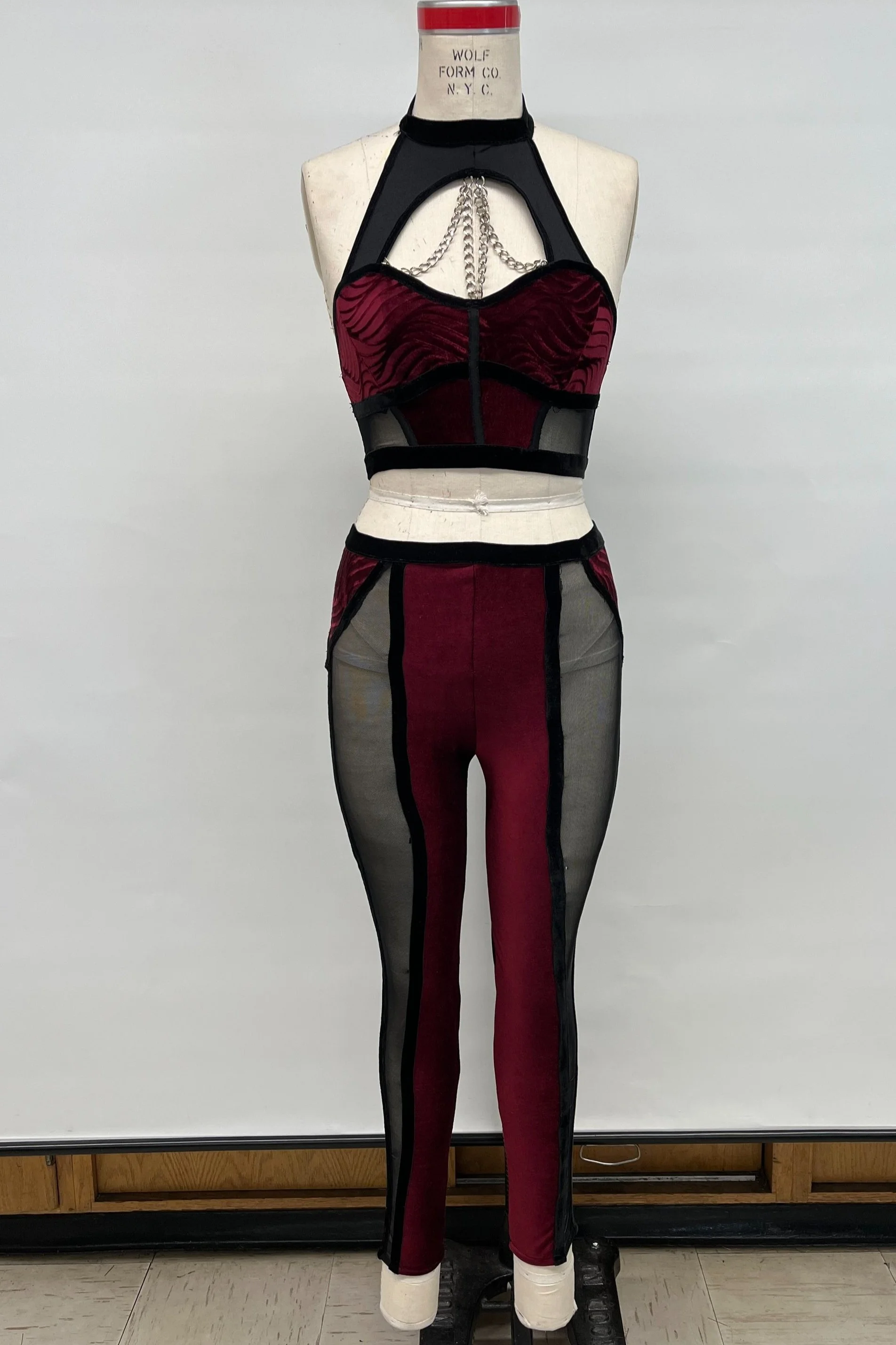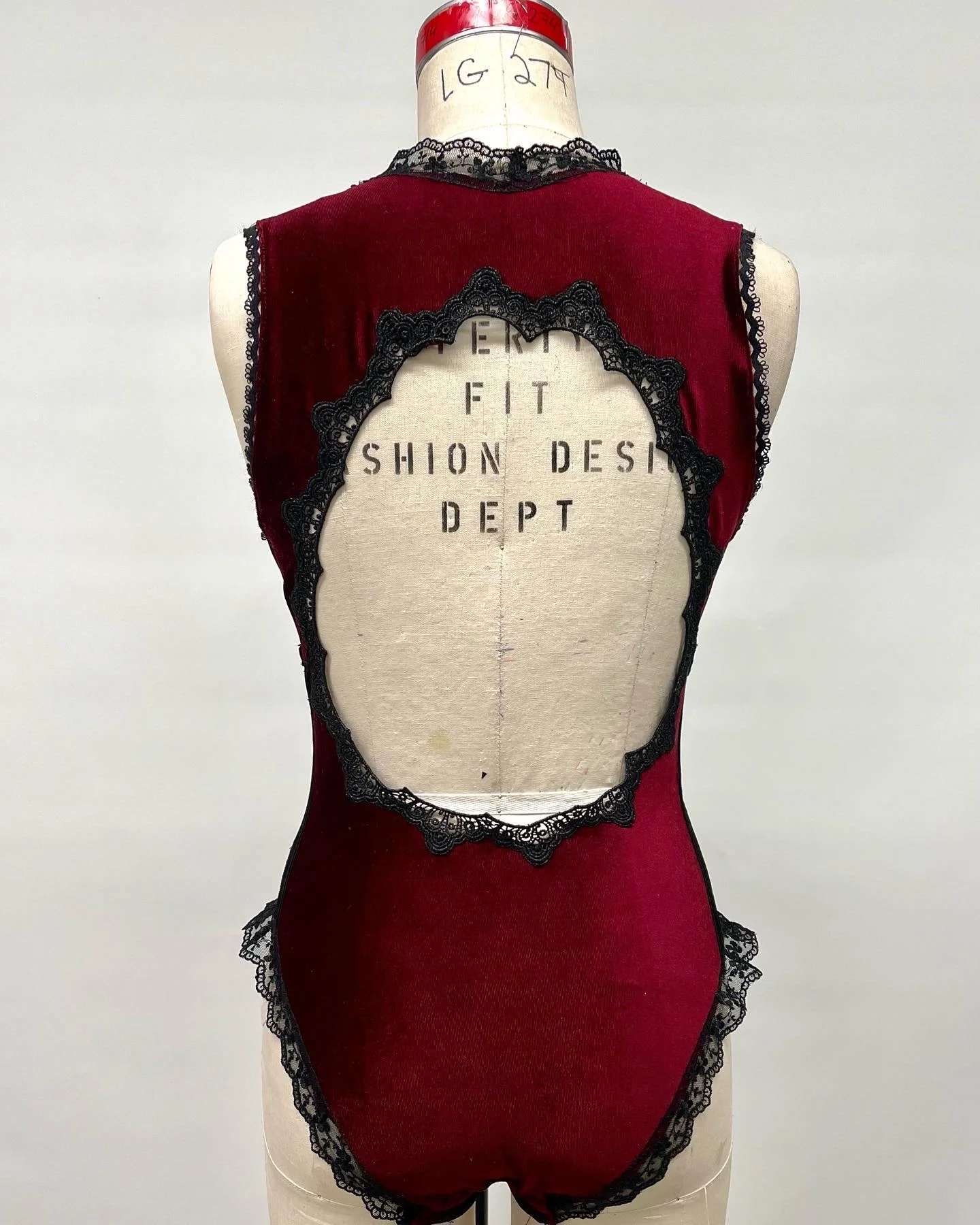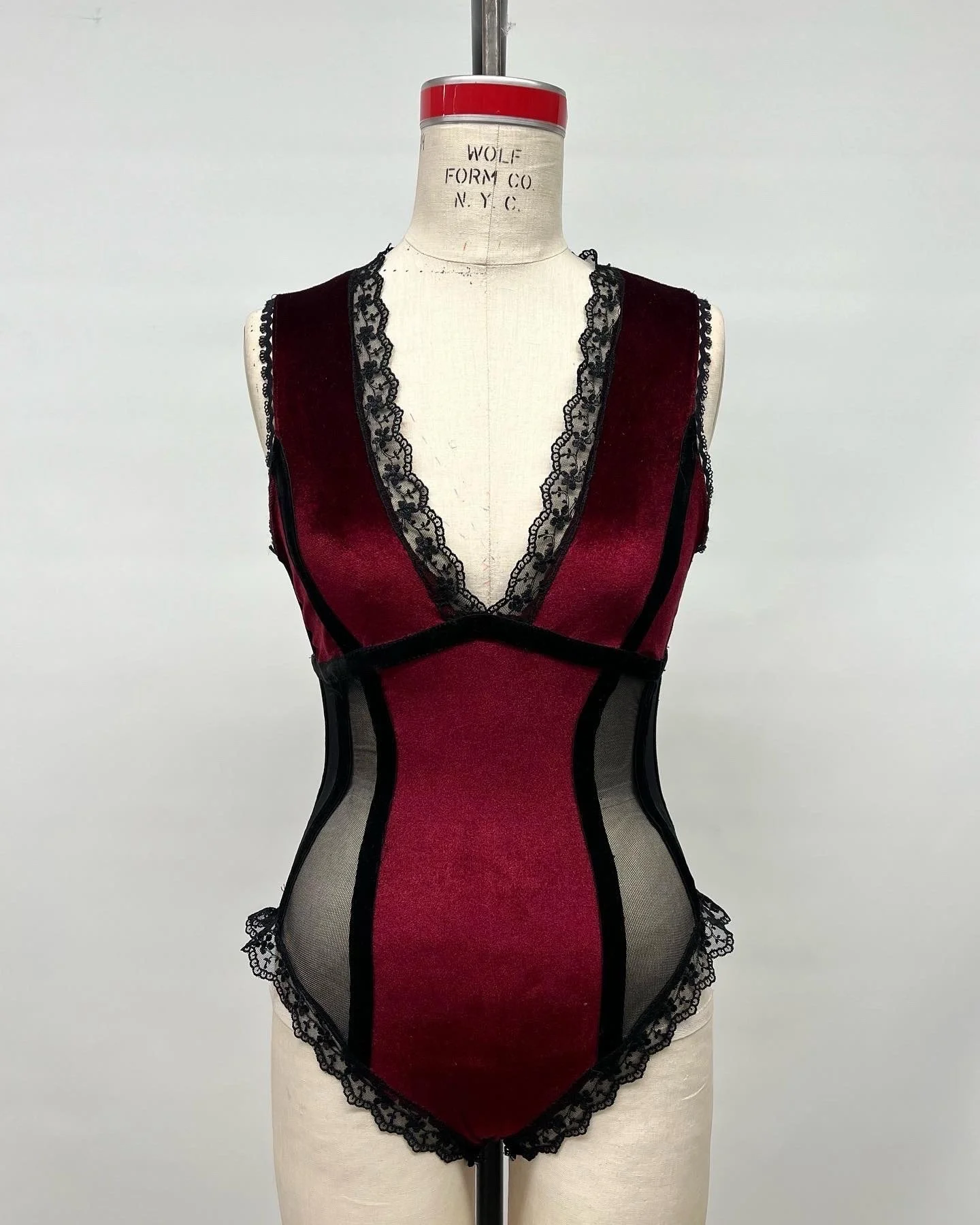 Staying true to the concept of abundance, this meticulously crafted bodysuit has been designed to flawlessly conform to the body, accentuating the bust and hips. The creation of this piece entailed the skillful use of various lace and velvet trims, resulting in a seductive and couture aesthetic.
