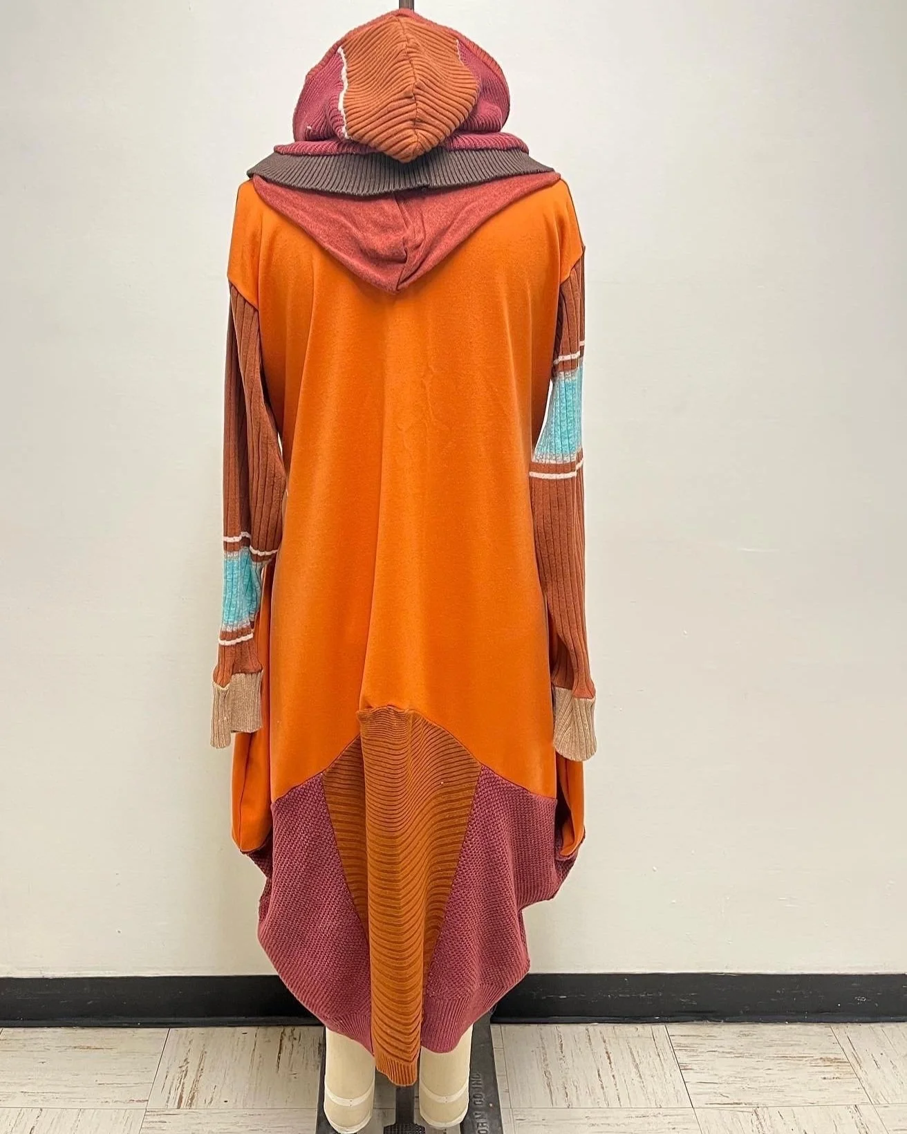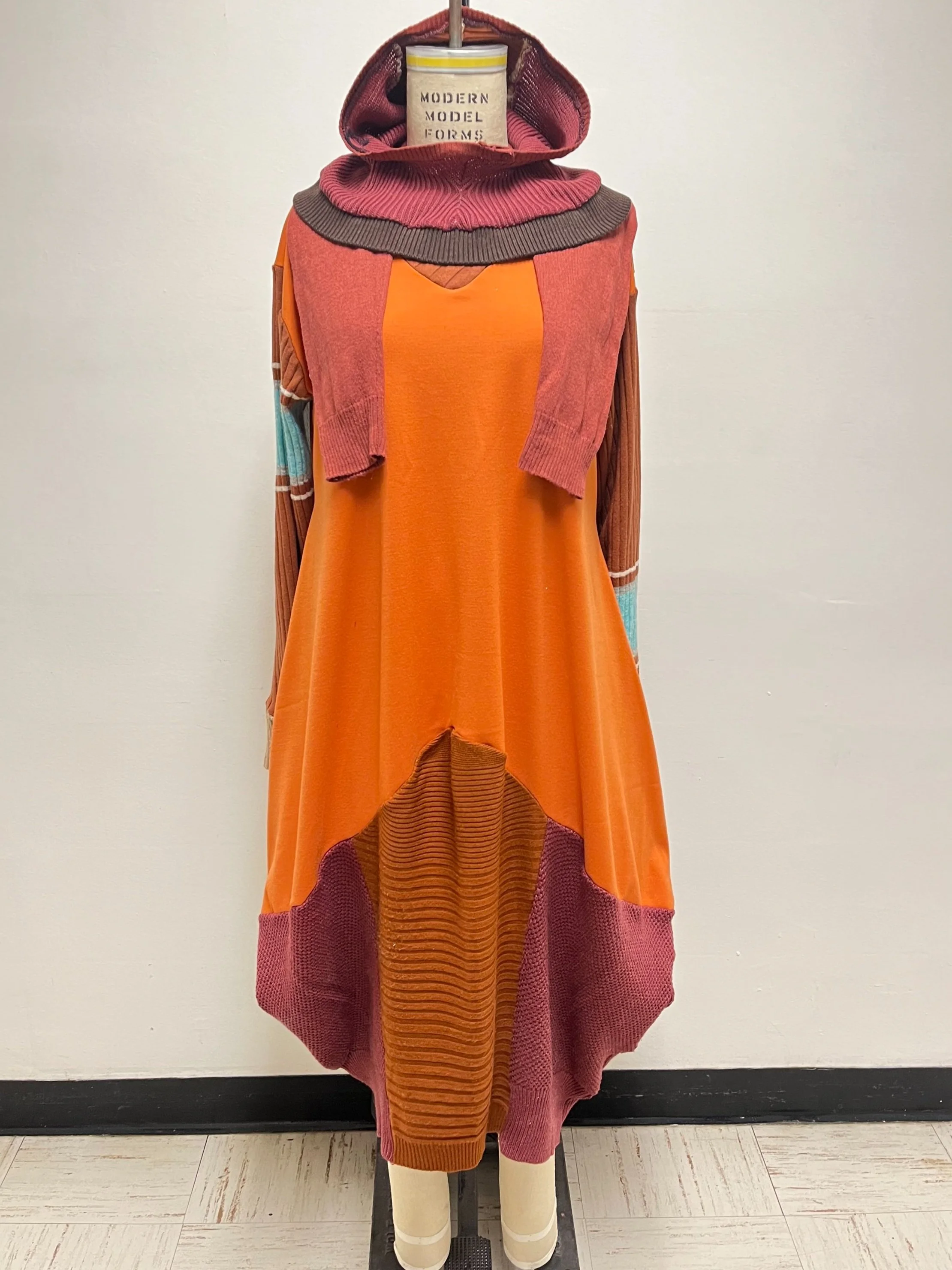 This ensemble comprises a knit dress, a balaclava, and a scarf, all skillfully crafted from recycled sweaters. This project pushed the boundaries of transforming the mundane into something exceptional. The lower part of the knit dress was ingeniously shaped using sweater sleeves, while the bodice was fashioned from repurposed fabric. Similarly, the balaclava and scarf were both fashioned from sweater sleeves.